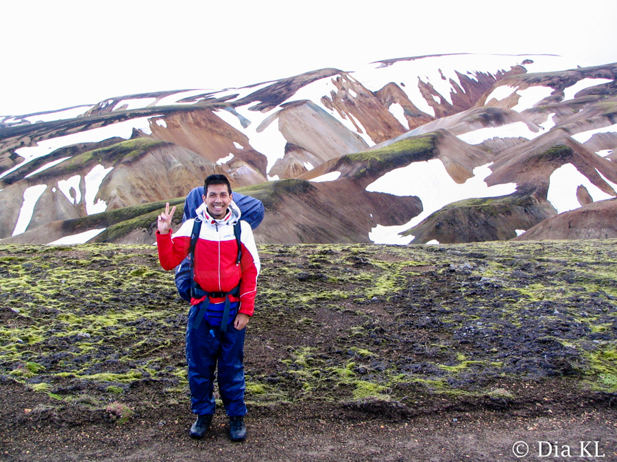 When I woke up at 7.30am it was raining hard. We decided to wait for a while for the rain to stop. This trek is one of my main reasons coming to Iceland. It is known as the Laugavegur hike, from Landmannalaugar to Thorsmork. The trail offers a great variety of landscape, mountains in almost every colour of the rainbow, great glaciers, roaring hot springs, big rivers and lakes. Generally the hike lasts four days. Finally we started walking around 11.00am when the rain had stopped. That day we had to walk 12km, all uphill, destination was the Hrafntinnusker hut.